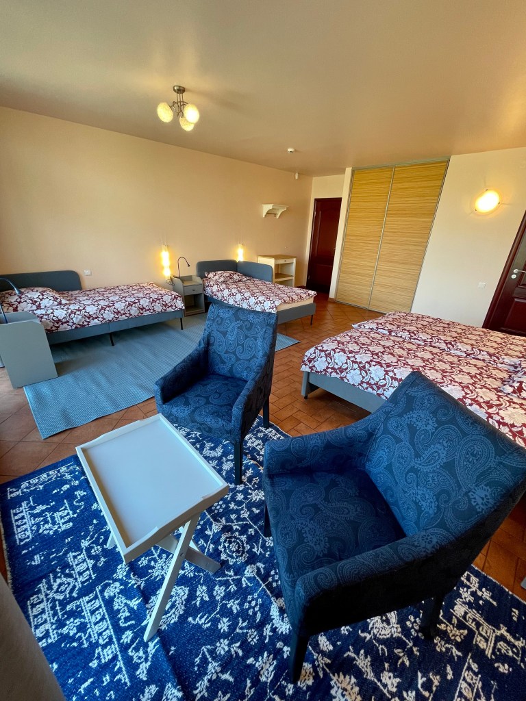 Erdvus liukso klasės numeris, idealiai tinkantis šeimoms ar draugų kompanijoms, įsikūręs trečiame aukšte. Jūsų patogumui – 160 cm pločio dvigulė lova, komfortiškas gulimasis krėslas, svetainės zona su dvigule sofa-lova, dviem patogiais krėslais ir mini virtuvės salele, erdvus vonios kambarys su dušu ir privatus balkonas su jaukiu vaizdu į kiemą.