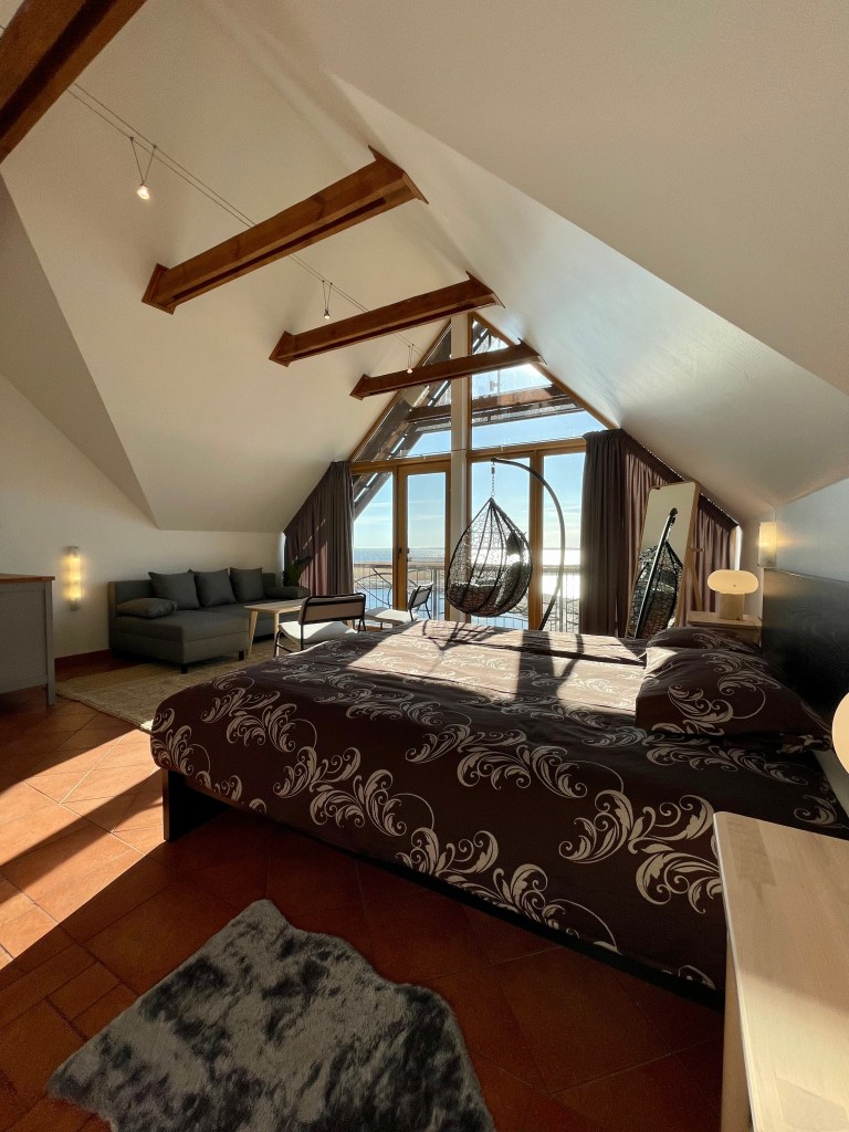 Svečiai ypač mėgsta šį erdvų, trečiame aukšte įsikūrusį liukso numerį, iš kurio atsiveria nuostabūs Kuršių marių vaizdai. Čia rasite 160 cm pločio dvigulę lovą, erdvų vonios kambarį su dušu, jaukią svetainės zoną su dvigule sofa-lova, dviem patogiais krėslais, krėslu-lizdu ir mini virtuvės salele. Privatus balkonas leis mėgautis nepakartojama panorama.