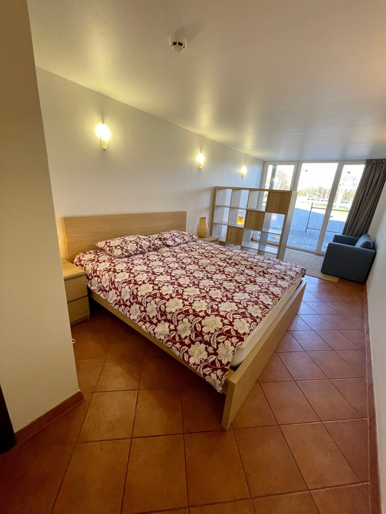 Svečių pamėgtas, patogus studijos tipo numeris, kuriame rasite viską, ko reikia puikiam poilsiui. Čia yra dvi didelės (160 cm pločio) dvigulės lovos, svetainės zona su dvigule sofa-lova ir dviem krėslais, mini virtuvėlė ir erdvus vonios kambarys. Studija turi erdvią terasą, iš kurios atsiveria įspūdingas vaizdas į Kuršių marias.