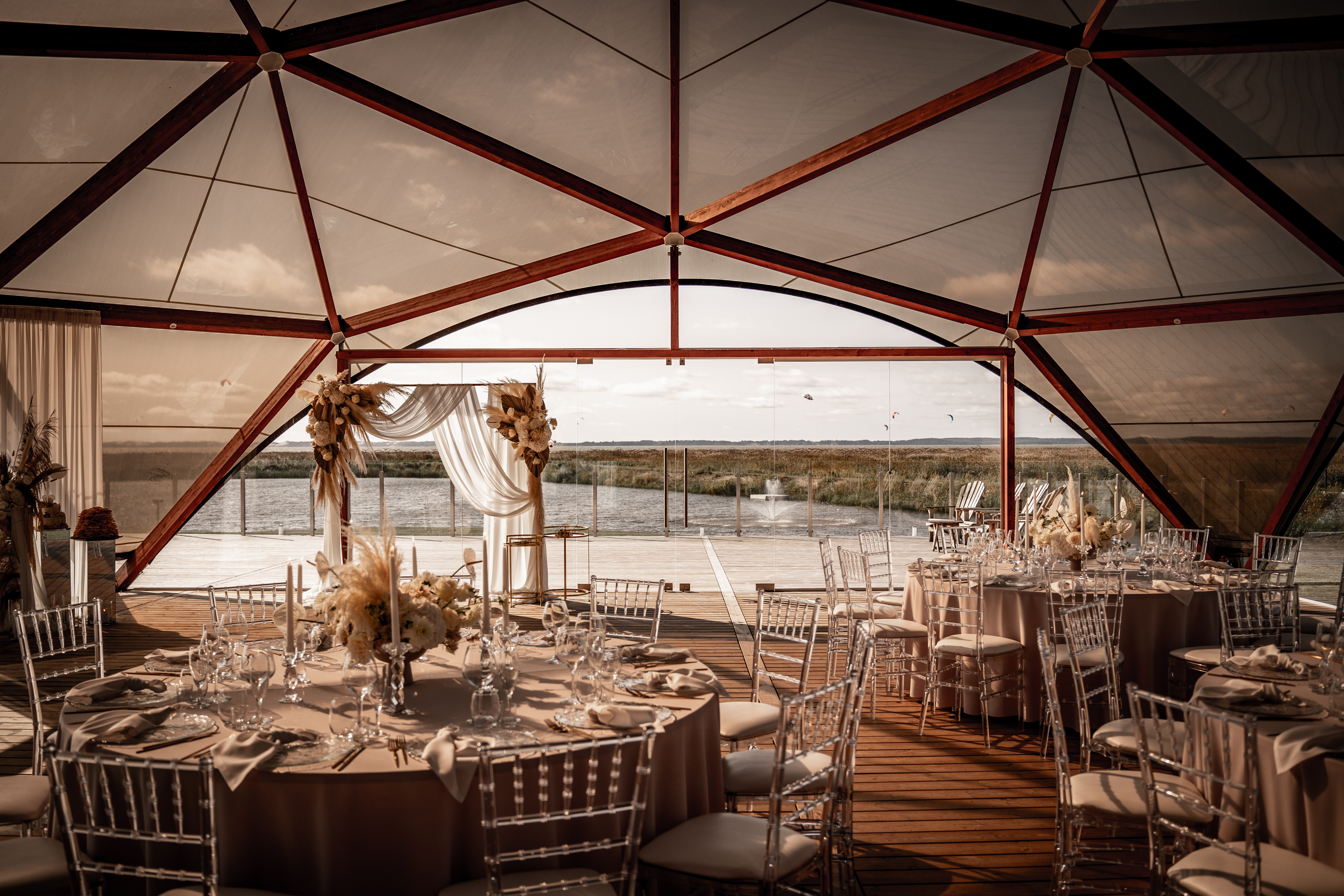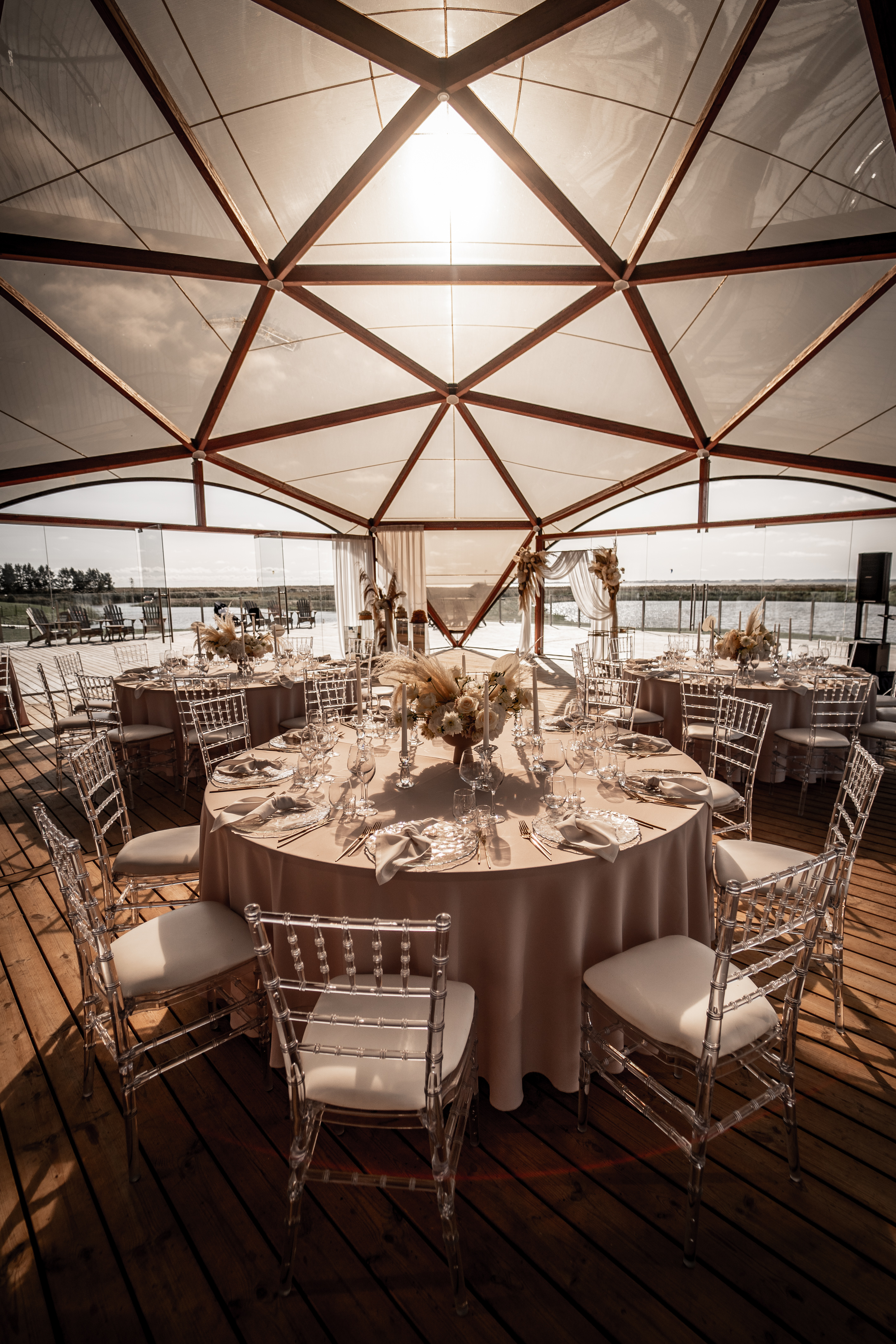 Kupolas nėra dekoruojamas iš anksto, tačiau tai leidžia jums ir jūsų pasirinktoms dekoratorių komandoms sukurti unikaliai jūsų šventei pritaikytą aplinką. Permatomas kupolas su vaizdu į Kuršių marias, Kuršių Nerijos kopas ir žvaigždėtą dangų taps puikia drobe įspūdingiems dekoratorinių sprendimų įgyvendinimams. Pagal jūsų pageidavimus kupole galime palikti apvalius stalus ir kreminės spalvos kėdes arba suteikti visiškai tuščią erdvę jūsų vizijai realizuoti.